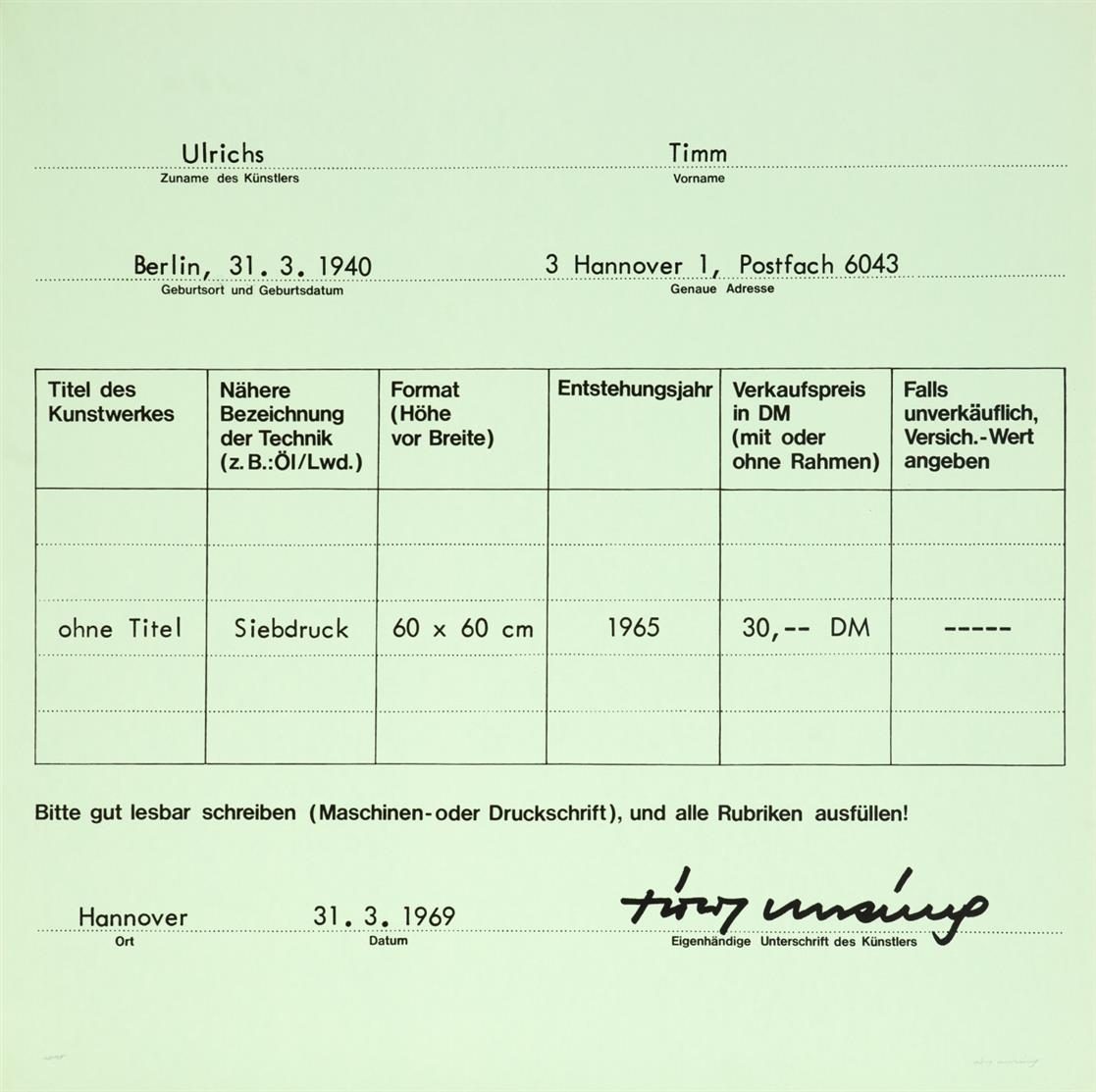 Ulrichs, Timm: VORSICHT, KUNST! Kestner Gesellschaft Hannover, 1969/70. Hannover. Kestner Gesellschaft. 1969. 61,5 x 61,5 cm. 1 Blatt Inhalt, 15 Grafiken. OKarton-Flügelmappe. Ein Blatt mit sehr kleinem Einriss, Mappenkanten gering berieben, sonst sehr gutes Exemplar. Mappenwerk mit 15 teils farbigen Originalgrafiken in Siebdruck und 1 Blatt „Inhaltsverzeichnis“ in Offsetdruck. 1969 als Jahresgabe der Kestner Gesellschaft herausgegeben. Nummer 72 / 120 auf jedem Blatt nummerierten und signierten Exemplaren. Ein im Inhaltsverzeichnis als Blatt 14 genanntes „vernichtetes Bild / objet perdu“ ist seiner Bestimmung anheim gefallen und fehlt in allen Mappen. Die Blätter 60 x 60 cm auf festem Karton. Die Mappe selber ist auf dem Innendeckel ebenfalls handschriftlich nummeriert und signiert, der Mappendeckel ist ebenfalls in Siebdruck.