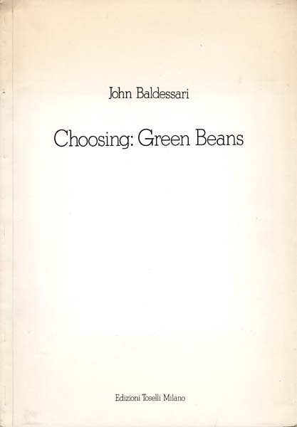 Baldessari, John: Choosing: Green Beans. Tiratura 1500 copie. Milano. Edizioni Toselli. 1972. 29,5 x 21,0 cm. 14 unpaginierte Blatt. OKarton. Einband an der oberen vorderen Stoßkante gering gestaucht. Hinten stärker, vorne gering lichtrandig. Am unteren Kapital geringe Quetschspur. Ordentliches Exemplar. Enthält 9 Fototafeln mit Variationen von jeweils drei grünen Bohnen. Mit einem kurzen Einführungstext von John Baldessari in Italienisch und Englisch. [Vgl. Cosje van Bruggen: John Baldessari, New York 1990, S. 235; Anne Moeglin-Delcroix, Esthetique du Livre d´Artiste 1960/1980, Paris 2012, S.318; Künstler Bücher, Krefelder Kunstmuseum 1993, S. 11; Lailach. Printed Matter – Die Sammlung Marzona, 2005, S. 92].