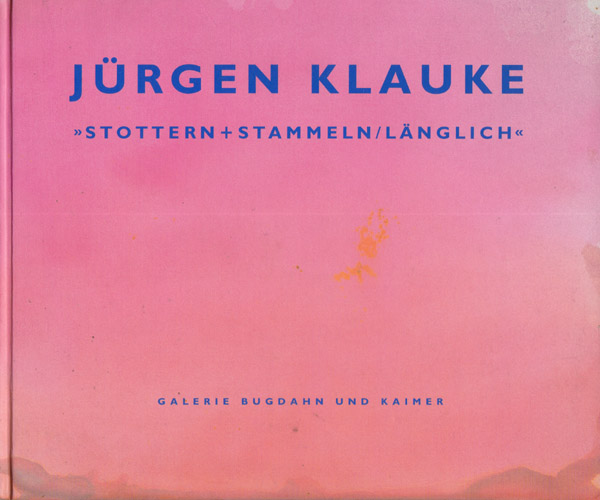 Klauke, Jürgen: Stottern + Stammeln/ Länglich. Auflage 600 Exemplare. Düsseldorf. Galerie Bugdahn und Kaimer. 1994. 21 x 24 cm. 71 S. Illustrierter OPappband. Einbandkanten mit kleinen Bereibungen, Kanten des Vorderdeckels minimal gestaucht. Sonst gutes Exemplar. Katalog zur Ausstellung Düsseldorf 1994 durchgehend mit Abbildungen sowie einem Textbeitrag von Norbert Jocks versehen und in limitierter und nummerierter Auflage von 600 Exemplaren erschienen.