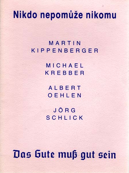 Kippenberger, Martin / Michael Krebber / Albert Oehlen / Jörg Schlick: Nikdo nepomuze nikomu. Das Gute muß gut sein. Prag. Galerie Hlavniho Mesta. 1992. 28,0 x 20,9 cm. 24 unpaginiere S. OKarton. Vom Rücken her etwas gebräunt, teils gering angestaubt. Gutes Exemplar. Erschienen anläßlich der gleichnamigen Galerieausstellung in Prag vom 20. September bis 19. November 1992, organisiert durch die Initiative Jörg Schlicks. Durchgehend mit Abbildungen versehen. [Vgl. Uwe Koch. Kommentiertes Werkverzeichnis der Bücher von Martin Kippenberger, Nr. 113].