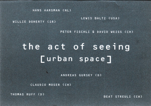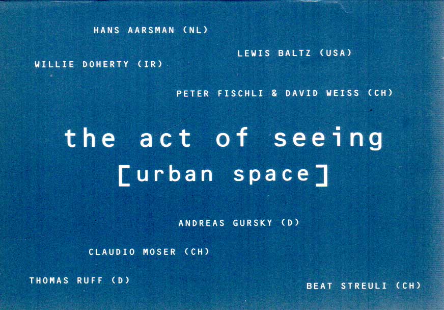 Küng, Moritz [Herausgeber/ Editor]: The act of seeing (urban space). Hans Aarsman, Lewis Baltz, Willie Doherty, Peter Fischli & David Weiss, Andreas Gursky, Claudio Moser, Thomas Ruff, Beat Streuli. Erste Auflage. Brüssel. Edition fondation pour l’architecture. 1994. 11 x 15 cm. Leporello in 8 Segmenten (Postkarten). Kanten mit minimalen Bereibungen. Sonst sehr gutes Exemplar. Erschien anlässlich der Ausstellung Brüssel 28. 1. bis 6. 3. 1995. Die Postkarten zeigen Motive Hans Aarsman, Lewis Baltz, Willie Doherty, Peter Fischli & David Weiss, Andreas Gursky, Claudio Moser, Thomas Ruff und Beat Streuli.