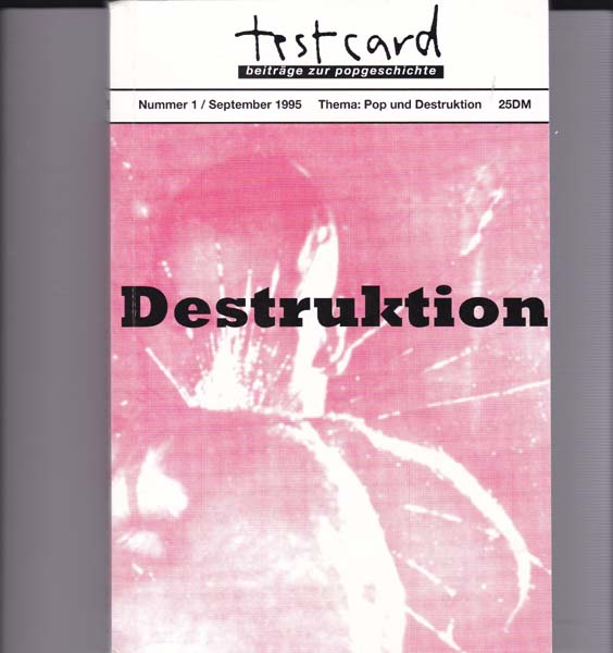 Büsser, Martin [Herausgeber]: Testcard. Beiträge zur Popgeschichte. Nummer 1/ September 1995 Thema: Pop und Destruktion. Erste Auflage. Oppenheim. Testcard-Verlag. 1995. 23 x 15 cm. 278 S., 1 Blatt. Illustrierter OKarton. Sehr gutes Exemplar. Die erste Nummer behandelt u.a. Antischallplatten, Die Wiener Gruppe, Laibach, Punk, The Clash u.v.m. Mit Textabbildungen versehen.