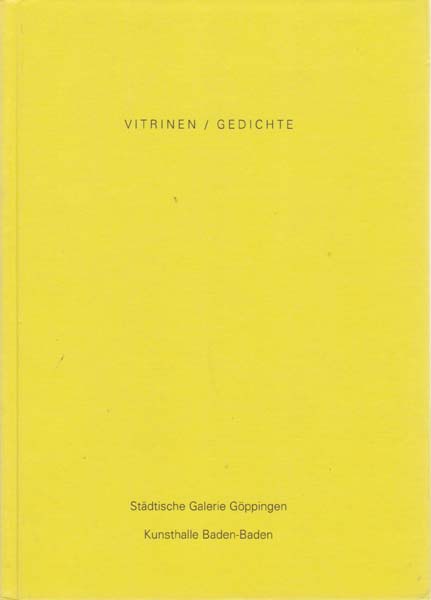Leberer, Camill – Werner Meyer/ Margrit Brehm [Herausgeber]: Vitrinen/ Gedichte. Erste Auflage. Göppingen. Baden-Baden. Städtische Galerie Göppingen. Kunsthalle Baden-Baden. 1998. 21,5 x 15,5 cm. 63 S. OPappband. Einbandkanten mit minimalen Bereibungen. Sonst sehr gutes Exemplar. Katalog zu den Ausstellungen Göppingen 1.2. bis 31. 3. 1998 und Baden-Baden 11. 9. bis 11. 10. 1998 durchgehend mit Abbildungen versehen.