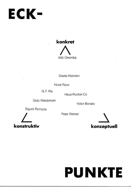 Eck-Punkte. Positionen konkret-konstruktiver Kunst heute. Victor Bonato Haus-Rucker-Co Gisela Kleinlein Willi Otremba Horst Rave G.F. Ris Sigurd Rompza Peter Werner Gido Wiederkehr. Erste Auflage. Bonn. Gesellschaft für Kunst und Gestaltung. 1987. 29,5 x 21 cm. 49 S. OBroschur. Einbandkanten etwas nachgedunkelt und mit kleinen Bereibungen. Sonst gutes bis sehr gutes Exemplar. Katah zu den Ausstellungen Bonn 17. 1. bis 21. 2. 1987 und 5. 3. bis 11. 4. 1987 durchgehend mit ganzseitugen Werkabbildungen der ausgestellten Künstler versehen.