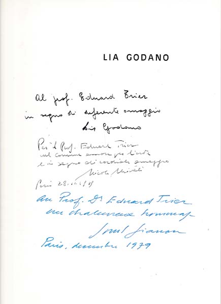 Godano, Lia – Ionel Jianou/ Nicola Micieli: Lia Godano. Erste Auflage. Paris. ARTED, Editiond d’Art. 1979. 30,5 x 24,5 cm. 47 S. Text/ 1 Blatt/ 22 Blatt Abbildungen/ 1 Blatt. OLeinen mit illustriertem OUmschlag. Umschlag- und Einbandkanten mit kleinen Bereibungen. Sonst gutes bis sehr gutes Exemplar. Mit zahlreichen ganzseitigen, schwarz-weissen Abbbildungen der Skulpturen versehen. Mit eigenhändigen Zueignungen von Künstlerin und Herausgebern an einen ehemaligen Direktor der Kunstakademie Düsseldorf auf dem Vortitel! Text in französischer und italienischer Sprache.