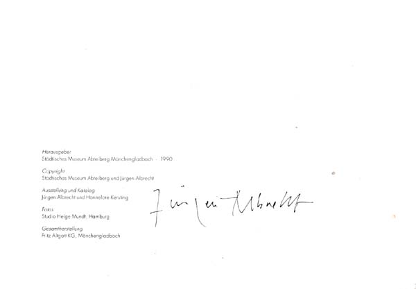 Albrecht, Jürgen: Städtisches Museum Abteiberg Mönchengladbach. 28. Januar – 18. März 1990. 1. Auflage. Mönchengladbach. Städtisches Museum Abteiberg Mönchengladbach. 1990. 17 x 24 cm. 12 unpaginierte S. OKarton. Sehr gutes Exemplar. Leporellokatalog. Mit einem Text von Hannelore Kersting, „Raum für Imagination“ sowie 6 Abbildungen als Falttafeln. Mit eigenhändiger Signatur des Künstlers auf der Rückseite!