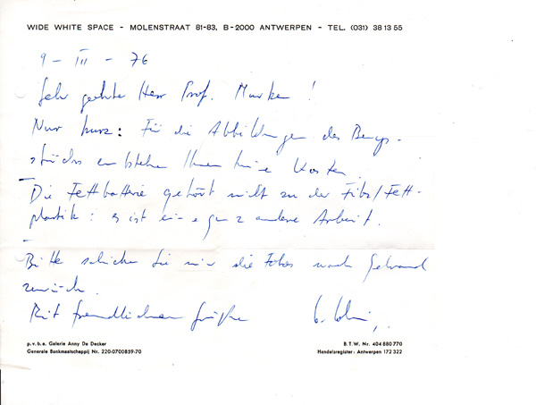 (Lohaus, Bernd): Handschriftlicher Brief an einen Sammler. Antwerpen. Wide White Space. 1976. 15,5 x 21,5 cm. 1 Blatt. Brief seitlich gelocht, sonst gutes Exemplar. Handschriftlicher Brief von Bernd Lohaus auf Briefpapier der Wide White Space Galerie an den Sammler Axel Murken, datiert 9. III. 1976, signiert. Nimmt Bezug auf Abbildungen von Beuys-Arbeiten.