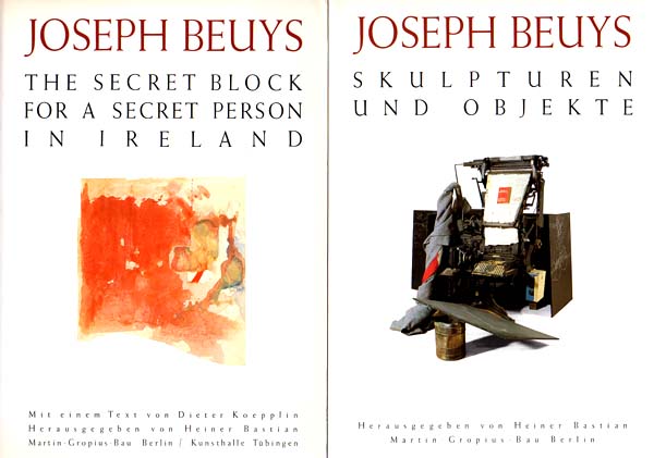Beuys, Joseph: Skulpturen und Objekte / The secret block for a secret person in Ireland. Martin Gropius Bau, Berlin, 20.2.-1.5.1988. Katalog Band 1: Herausgegeben von Heiner Bastian. Mit Beiträgen von Götz Adriani, Heiner Bastian, Franz Joseph van der Grinten [und einigen anderen]. Katalog Band 2: Text von Dieter Koepplin. Katalogbearbeitung von Celnine Bastian. Herausgegeben von Heiner Bastian. Erste Ausgabe. 3 Bände. München. Schirmer / Mosel Verlag. 1988. 31 x 22 cm. 338 S.; 524 S.; [152] S. OLeinen mit OUmschlag; Karton. Minimale Gebrauchspuren. Sehr gutes Exemplar. Begleitbuch zur Doppel-Ausstellung im Martin Gropius Bau, Berlin, 20.2.-1.5.1988 in 2 Bänden, in der gebundenen Buchhandelsausgabe. Mit hunderten Abbildungen. Beiliegend eine privat aufgebundene Pressemappe mit kopierten Ausstellungsrezensionen und Zeitungsartikeln.
