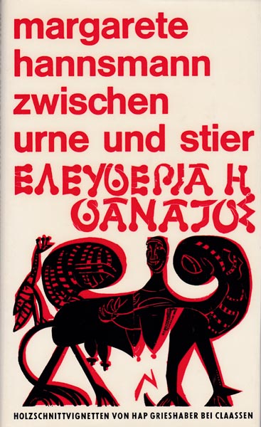 Grieshaber, HAP . Margarete Hannsmann: Zwischen Urne und Stier. Gedichte. Erste Auflage. amburg/ Düsseldorf. Claassen. 1971. 21 x 12,5 cm. 101 S., 1 Blatt. OLeinen mit illustriertem OUmschlag. Umschlagkanten etwas nachgedunkelt und mit kleinen Bereibungen. Sonst gutes bis sehr gutes Exemplar. Gedichte von Margarete Hannsmann illustriert mit 10 Holzschnitt-Vignetten und einem vom Stock gedruckten Holzschnitt von HAP Grieshaber. Nit eigenhändiger Signatur des Künstlers auf dem Frontispiz und der Dichterin auf dem Titelblatt!