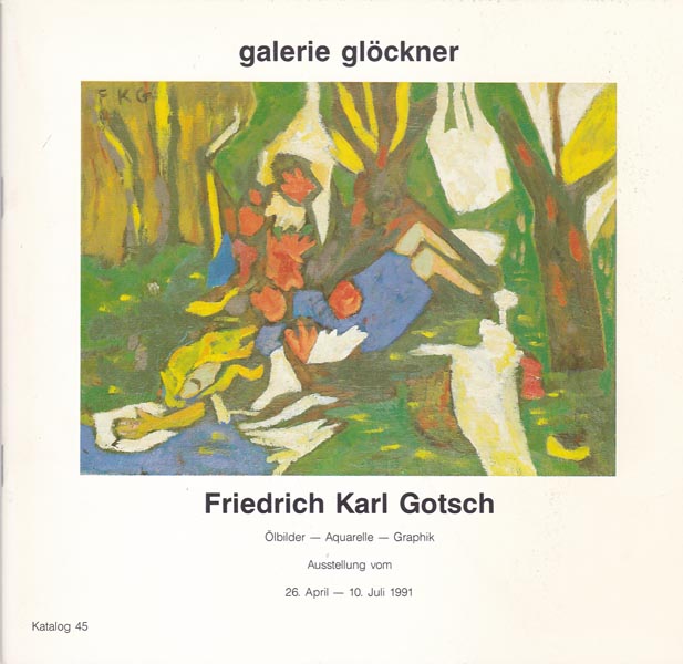 Gotsch, Friedich Karl: Ölbilder Aquarelle Graphik. Erste Auflage. Köln. Galerie Glöckner. 1991. 20 x 21 cm. 24 S. Illustrierte OBroschur. Einbandkanten etwas nachgedunkelt und mit kleinen Bereibungen. Gutes Exemplar. Katalog 45. Katalog zur Ausstellung Köln 26. April bis 10. Juli 1991 durchgehend mit ganzseitigen Werkabbildungen versehen, darunter einige farbige. Inliegend Preisliste.