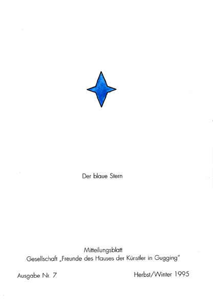 Der blaue Stern. Mitteilungsblatt der Gesellschaft der Freunde des Hauses der Künstler in Gugging. Ausgabe Nr. 7. Herbst/ Winter 1995. Gugging. Eigenverlag. 1995. 21 x 14,5 cm. 35 S. OBroschur. Einbandkanten etwas nachgedunkelt. Sonst gutes bis sehr gutes Exemplar. Nr. 7 des hauseigenen Mitteilungsblattes Gugging 1995 mit vier montierten Postkarten versehen, davon drei farbige.