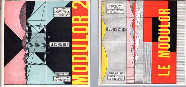 Le Corbusier: Le Modulor/ Modulor 2. 2 Bände. Boulogne (Seine). Editions de L’Architecture D’Aujourd’hui. 1965 / 1968. 14,5 x 14 cm. 239 S./ 341 S. OKarton mit illustrierten OUmschlägen. Umschläge- und Einbandkanten leicht nachgedunkelt und mit Bereibungen, etwas angestaubt. Sonst gutes Exemplar. Über Le Corbusiers Modulor, ein vom Architekten in den Jahren 1942 bis 1955 entwickeltes Proportionssystem mit dem Versuch, der Architektur eine am Maß des Menschen orientierte mathematische Ordnung zu geben. Hier der Band 1 der französischen Originalausgabe in der 5. Auflage von 1965, der Band 2 ebenfalls in der französischen Originalausgabe in der 3. Auflage von 1968. Mit einigen schwarz-weissen Textabbildungen versehen!