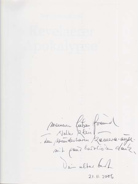 Gerresheim, Bert: Kevelaerer Apokalypse. Erste Auflage. Kevelaer. Verlag Butzon & Bercker. 2003. 28,5 x 24,5 cm. 198 S. OLeinen mit illustriertem OUmschlag. Umschlagkanten mit kleinen Bereibungen. Sonst gutes bis sehr gutes Exemplar. Über das großformatige Reliefbild von Bert Gerresheim an der Hauptfassae der Kevelaerer Marienbasilika durchgehend mit Abbildungen versehen. Mit eigenhändiger mehrzeiliger Zueignung des Künstlers, signiert ″ Dein alter Gert“ und datiert „21. 11. 2006“ an einen Düsseldorfer Fotografen auf dem Vorsatzblatt.