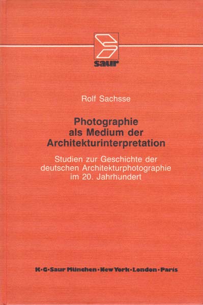 Sachsse, Rolf: Photographie als Medium der Architekturinterpretation. Studien zur Geschichte der deutschen Architekturphotographie im 20. Jahrhundert. Erste Auflage. München/ New York/ London/ Paris. Saur Verlag. 1984. 23,5 x 16 cm. 469 S. OPappband. Gutes bis sehr gutes Exemplar. Mit einigen Abbildungen versehen! Zugl.: „Angefertigt mit Genehmigung der Philosophischen Fakultät der Rheinischen Friedrich-Wilhelms-Universität zu Bonn. Mit eigenhändiger Zueignung des Verfassers an einen ehemaligen Direktor der Kunstakademie Düsseldorf!