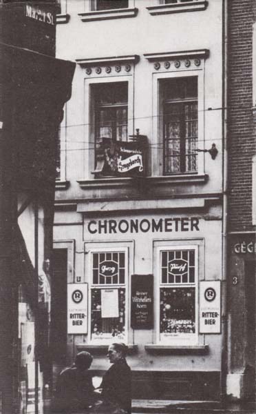 Grote, Günter: Chronometer. Erste Auflage. Edition Marzona. 1987. 21 x 13 cm. 135 S. OPappband mit illustriertem OUmschlag. Umschlagkanten mit kleinen Bereibungen. Sonst gutes bis sehr gutes Exemplar. Autobiographischer Roman über eine Düsseldorfer Künstlergruppe und ihre Treffen im orstansässigen Lokar „Chronometer“ zwischen 1935 und 1942. Mit eihigen Abbildungen versehen.