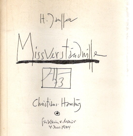 Janssen, Horst: Missverständnisse. Herausgegeben von Gerhard Schack. Erste Ausgabe. Hamburg. Hans Christians Verlag. 1973. 18 x 20 cm. 24 Blatt (Leporello). OKarton. Umschlagkanten lichtrandig und gebräunt, Kanten stellenweise fleckig, insgesant etwas gebrauchsspurig. Ordentliches Exemplar. Leporello mit 24 farbig wiedergegebenen Zeichnungen. Auf dem Titelblatt von Janssen handschriftlich monogrammiert und datiert 73 mit einer handschriftlichen Widmung an eine deutsche Kunsthistorikerin.