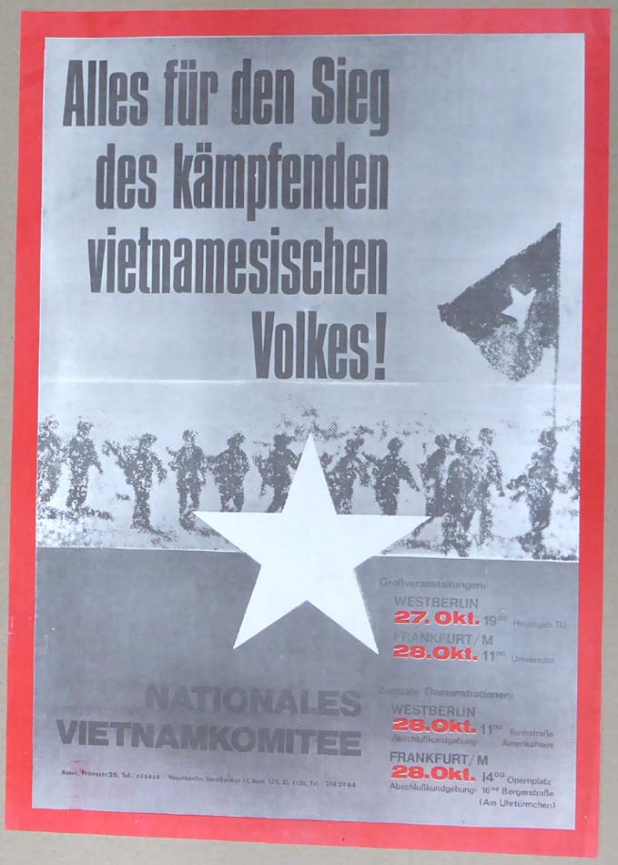 Alles für den Sieg des kämpfenden vietnamesischen Volkes! [Plakat / Poster] NATIONALES VIETNAMKOMITEE, Bonn. Großveranstaltungen: WESTBERLIN, 27. Okt.; FRANKFURT/M, 28. Okt. Zentrale Demonstrationen: WESTBERLIN, 28. Okt.; FRANKFURT/M, 28. Okt. [1972]. 57 x 40,5 cm. OPapier-Plakat. Sehr gutes Exemplar.
