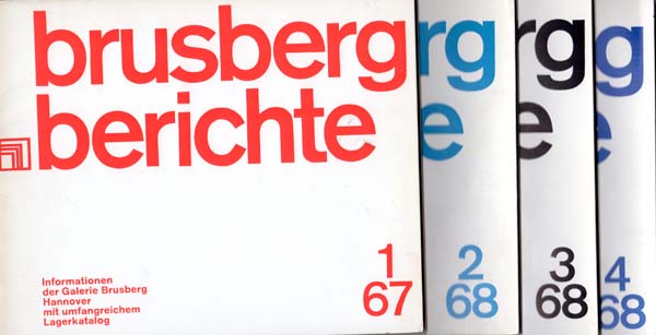 Brusberg-Berichte 1 – 27. Informationen der Galerie Brusberg Hannover mit umfangreichem Lagerkatalog. Erste Aufllage. 27 Bände. Hannover. Galerie Brusberg. 1967 – 1983. 18 x 22,5 cm. 112 S.,40 S., 50 S., 40 S., 188 S., 88 S., 60 S., 120 S., 100 S., 126 S., 112 S., 114 S., 95 S., 108 S., 98 S., 92 S., 1 Blatt, 114 S., 94 S., 118 S., 122 S., 140 S., 1 Blatt, 111 S., 126 S., 132 S., 120 S. OKarton, OPappband (nur Band 5). Einbandkanten teilweise etwas nachgedunkelt und leicht berieben oder leicht angestaubt. Gutes bs sehr gutes Exemplar. Vollständige Folge der Brusberg-Berichte in 27 Teilen aus der ersten Zeit der Galerie in Hannover. Durchgehend mit Abbildungen versehen.