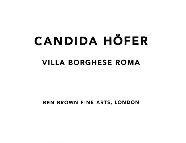 Höfer, Candida: Villa Borghese Roma. Erste Auflage. London. Ben Brown Fine Arts. 2014. 17,5 x 22,5 cm. 8 Blatt Text (Broschur), 20 lose Tafeln. OPappkassette. Tadelloses Ecemplar – originalverschweisst! Erschienen anlässlich der Ausstellung London 2014 mit 20 losen Fototafeln und einem broschierten Kommentar in englischer und italienischer Sprache.