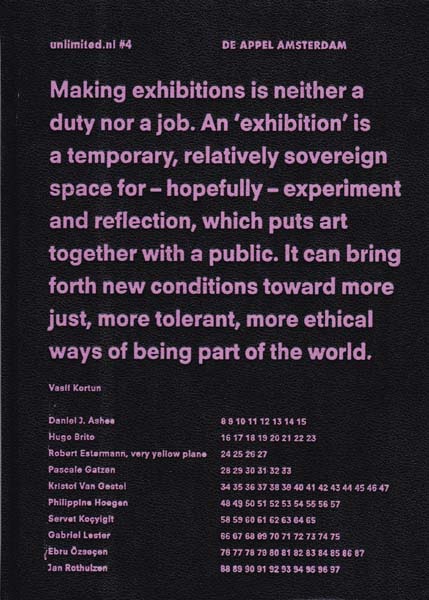 Kortun, Vasif [Herausgeber/Editor]: unlimited.nl.4. Erste Auflage. Amsterdam. de Appel. 2001. 19 x 13 cm. 103 S., 1 Blatt. OPappband. Sehr gutes Exemplar. Erschienen zur Ausstellung Amsterdam 26. Januar bis 18. März 2001, kuratiert von Vasik Kortun als 4. Schau von in den Niederlanden lebenden und arbeitenden jungen Künstlern. Durchgehend mit Abbildungen versehen. Text in englischer Sprache.