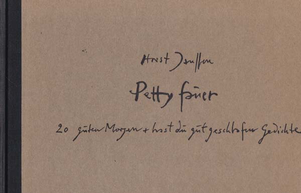 Janssen, Horst: Petty fauer. 20 guten Morgen + hast Du gut geschlafen Gedichte. Auflage 3000 Exemplare. Hamburg. Galerie Brockstedt. 1970. 16 x 23,5 cm. 44 unpaginierte S. OPappband. Einbandkanten minimal berieben. etwas angestaubt. Sonst gutes bis sehr gutes Exemplar. Durchgehend mit Illustrationen und kurzen Texten in Horst Janssens Handschrift versehen! Mit monogrammierter Signatur „JH 70“ auf dem vorderen Vorsatzblatt.