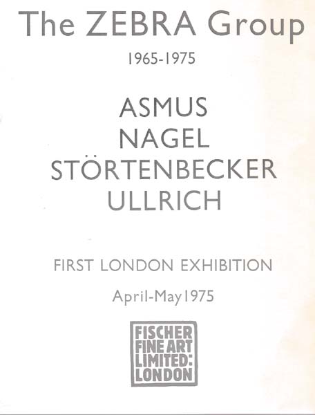 The Zebra Group 1965 – 1975. Asmus Nagel Störtenbecker Ullrich. Erste Auflage. London. Fischer Fine Art Ltd. 1975. 25 x 20 cm. 8 unpaginierte S. OBroschur, betitelt. Kanten etwas nachgedunkelt und berieben. Gutes Exemplar Erschienen zur Ausstellung London April – Mai 1975 mit einem Text von Wolf-Dieter Dube in englischer Sprache, zum Teil farbige Werkabbildungen von jedem der vier Künstler und Ausstellungsverzeichnis versehen. Inliegend: dreiteilige, gafaltete Einladungskarte zur gleichnamigen Ausstellung Stuttgart, September 1976, mit 4 schwarz-weissen Abbildungen. Hier die Kanten ebenfalls etwas nachgedunkelt und berieben, sonst gutes Exemplar. Ausserdem: Zebra-Manifest No. 1, Der Neue Realismus.