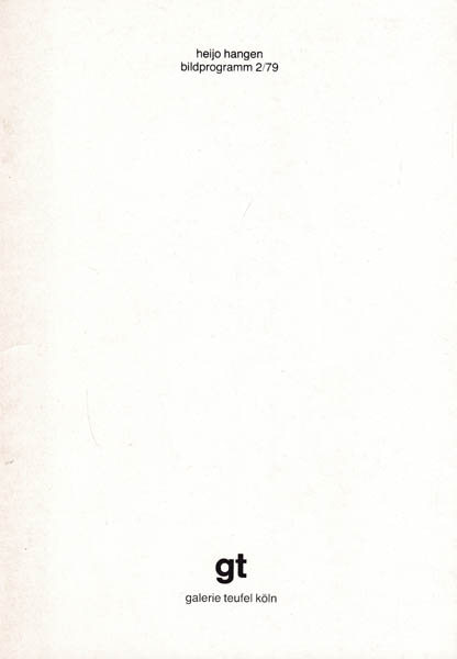 Hangen, Heijo: Bildprogramm 2/ 79/ 1 r. bis 11 r. und 1l. bis 11l. 342 vorformulierte Bildmöglichkeiten. Auflage 500 Exemplare. Köln. Galerie Teufel. 1981. 21 x 15 cm. 24 unpaginierte S. OBroschur. Einbandkanten etwas nachgedunkelt und berieben, Rückendeckel mit sehr kleiner Knickfalte. Sonst gutes bis sehr gutes Exemplar. Erschienen zur Ausstellung Köln Fenruar/ März 1981 durchgehend mit zum Teil farbigen Abbildungen sowie einem kurzen Text des Künstlers versehen!