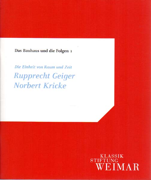 Güse, Ernst-Gerhard & Bestgen, Ulrike [Herausgeber]: Das Bauhaus und die Folgen 1. Die Einheit von Raum und Zeit – Rupprecht Geiger, Norbert Kricke. Erste Auflage. Weimar. Klassik Stiftung Weimar. 2006. 23 x 19,5 cm. 36 S. OBroschur. Sehr gutes Exemplar. Katalog zur Ausstellung der Klassik-Stiftung Weimar im Neuen Museum Weimar vom 07.07.2006 bis 28.01.2007. Aus der Reihe Das Bauhaus und die Folgen 1. Durchgehend mit meist farbigen Abbildungen versehen.