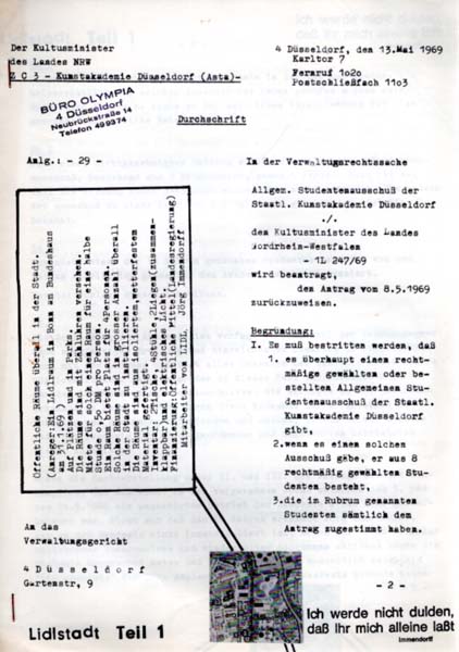 Immendorff, Jörg: Lidlstadt. Eine Arbeitswoche von und mit Jörg Immendorff. Erste Ausgabe. Düsseldorf. Selbstverlag Lidlraum. 1968. 29 x 21 cm. 32 unpaginierte S. OKarton. Umschlag verso gering angestaubt und fleckig, sonst sehr gutes Exemplar. Das xerographierte Heft enthält durchgegehend Fotowiedergaben. 1968 initiierte Jörg Immendorf mit Chris Reinecke die Lidl-Gruppe, die sich aus verschiedenen einzelnen zu kooperierten Aktionen entwickelte und drei Jahre anhielt. „Lidl bedeutete: künstleriche Arbeit in der Öffentlichkeit – heraus aus dem elfenbeinernen Turm in die Öffentlichkeit. Statt Kunst in Museen und Galerien die Mietung von geeigneten Räumen, die groß genug waren, um die Menschen von der Straße herein zu holen und sie bekannt zu machen mit unseren Ideen: Erweiterung des Bewußtseins aller.“ Ebenfalls 1968 proklamierten Reinecke und Immendorf bei einem Besuch der Karlsruher Kunstakademie dort die Lidl-Akademie und verursachten bei dem Versuch einer Demokratisierung der Akademie mit entsprechender Absetzung des Rektors einen Skandal. Erschien – vermutlich in kleiner Auflage – Ende 1968 in den Atellierräumen von Jörg Immendorff, Blücherstr. Ecke Parkstr. in Düsseldorf (genannt „Stützpunkt Immendorf). Mit Fotografien von Thomas Tilly. Beiliegend eine fünfseitige Kopie einer von Immendorff mit Stempeln (″Lidlstadt Teil 1“; „Ich werde nicht dulden, daß Ihr mich alleine laßt. Immendorff“), montierten Stadtplanausschnitten und einem maschinenschriftlichen Textkommentar überarbeiteten Durchschrift eines Antrags vom 13. Mai 1969 des Kultusministeriums des Landes NRW, in der Verwaltungsrechtsache des sogenannten „Allgemeinen Studentenausschusses der Staatlichen Kunstakademie Düsseldorf“ gegen den Kultusminister des Landes NRW in der Lidl-Angelegenheit (öffentliche Räume überall in der Stadt) den Antrag vom 8. Mai 1969 der Studenten zurückzuweisen. Die klammergeheftete, hektografierte Kopie trägt den Stempel des „Büro Olympia“ aus Düsseldorf. Seltenes Konvolut.