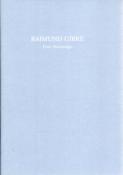 Girke, Raimund: Eine Hommage. Erste Auflage. Köln. Kunstraum Fuhrwerkswaage 2003. 23,5 x 17 cm. 16 unpaginierte S. OKarton mit OUmschlag. Minimaler Fleck auf der vorderen Einbandseite, sonst einwandfreies Exemplar. Erschienen anlässlich der Ausstellung des Kunstraum Fuhrwerkswaage Köln, 18.5. bis 1.6.2003. Durchgehend mit farbigen Abbildungen versehen. Beiliegend mit einer handschriftlichen, beidseitig beschriebenen Karte von Karin Girke sowie einem kopierten Schreiben an die deutsche Kunsthistorikerin Karin von Maur.