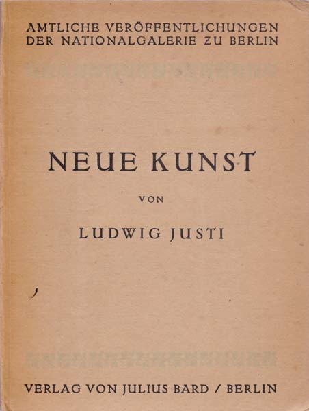 Justi, Ludwig: Neue Kunst. Ein Führer zu den Gemälden der sogenannten Expressionisten in der National-Galerie. Erste Auflage. Berlin. Julius Bard. 1921. 23,5 x 18 cm. 37 S. OPappband. Rücken teils etwas angeplatzt, Name auf Vorsatz, sonst gutes Exemplar. Amtliche Veröffentlichungen der Nationalgalerie zu Berlin. Abhandlung Ludwig Justs – zu dieser Dierektir der Berliner Nationalgalerie – über Kirchner, Heckel, Pechstein u.a. Mit 14 Abbildungen versehen.