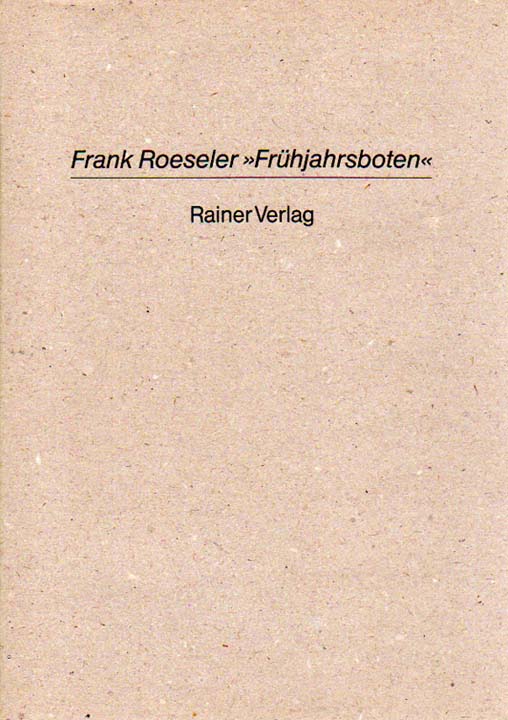 Roeseler, Frank: Frühjahrsboten. Auflage: 120 nummerierte und signierte Exemplare. Berlin. Rainer Verlag. 1992. 30 x 21 cm. 44 unpaginierte S. OKarton. Umschlag gering lichtrandig, Papier leicht nachgedunkelt. Gutes Exemplar.28 Im Impressum handschriftlich nummeriertes und von Frank Roeseler signiertes Exemplar, hier die Nummer 15 von 120. Durchgehend mit ganzseitigen Abbildungen versehen.