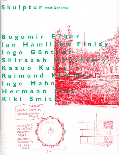 Galerie Fricke [Herausgeber]: Skulptur statt Denkmal. Ausstellungsprojekt 1993 bis 1995, Düsseldorf-Zitadellviertel zwischen Orangerie- und Poststraße. Bogomir Ecker – Ian Hamilton Finlay – Ingo Günther – Shirazeh Houshiary – Kazuo Katasa – Raimund Kimmer – Inge Mahn – Hermann Pitz – Kiki Smith. Erste Auflage. Ostfildern. Cantz Verlag. 1993-1995. 22 x 17 cm. 109 S. OLeinen mit illustriertem OUmschlag. Gutes bis sehr gutes Exemplar. Mit Textbeiträgen von Marion und Roswitha Fricke, Beate Ermacora, Perdita von Kraft, Peter Friese, Jo-Anne Birnie Danzker, Res Ingold, Martin Hentschel sowie von Annelie Pohlen. Durchgehend mit meist farbigen Abbildungen versehen.