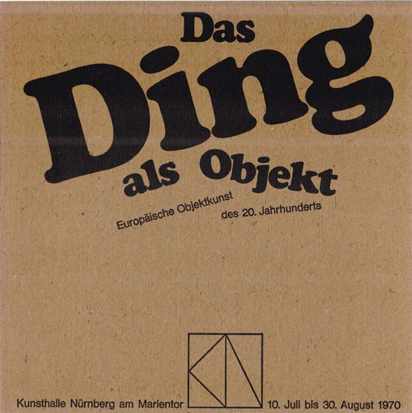 Roters, Eberhard [Herausgeber]: Das Ding als Objekt. Europäische Objektkunst des 20. Jahrhunderts. Erste Auflage. Nürnberg. Kunsthalle Nürnberg. 1970. 21 x 21 cm. 90 unpaginierte S. OKarton. Seitenränder und Schnitt papierbedingt gering gebräunt. Sonst gutes bis sehr gutes Exemplar. Katalog zur Ausstellung Nürnberg 10. Juli bis 30. August 1970. Durchgehend mi Abbildungen der ausgestellten Exponate versehen. Unter den teilnehmenden Künstlern waren Duchamp, Beuys, Arman, Christo, Kienholz u.v.a.
