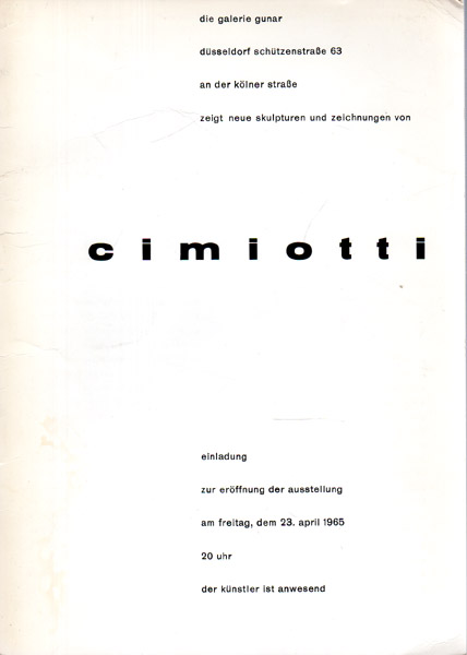 Cimiotti, Emil: Neue Skulpturen und Zeichnungen. Galerie Gunar Düsseldorf. Einladung (und Katalog) zur Eröffnung der Ausstellung am Freitag, dem 23. April 1965, 20.00 Uhr. Düsseldorf. Galerie Gunar. 1965. 21 x 15 cm. 6 unpaginierte S. OKarton. Sehr gutes Exemplar. Mit 8 Abbildungen. Beiliegend eine Einladung der Galerie Conzen in Düsseldorf aus der gleichen Zeit zu „Paul Bedra – Malerei und Graphik“.