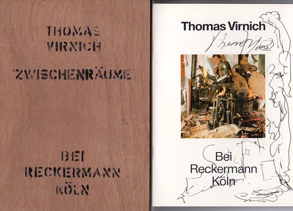 Virnich, Thomas: Zwischenräume. Thomas Vinrich bei Reckermann Köln. Ausstellung, Galerie Reckermann, 27. März bis 25. April 1987. Köln. Galerie Reckermann. 1987. 22 x 16 cm. 28 unpaginierte S. OKarton in Holzbox. Sehr gutes Exemplar. Katalog zu den Skulpturen mit meist farbigen Abbildungen. Einführung von Annelie Pohlen. Der Katalog lagert in einer bedruckten Buchenholzkiste (ähnlich einer Zigarrenschachtel). Schön gestalteter Objektkatalog. Der Umschlag des Kataloges mit ganzseitiger Übermalung in schwarzer Tinte von Thomas Virnich.