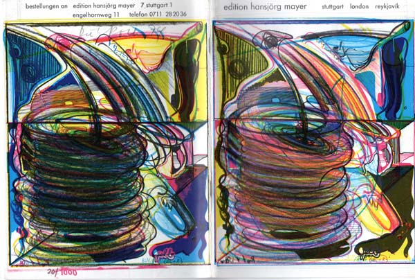 [Roth, Dieter]: edition hansjörg mayer verlagsverzeichnis 1974. neuerscheinungen und noch erhältliche titel. [Herausgegeben von H. J. Mayer und D. Roth.] Auflage 1000 Exemplare. Stuttgart. London. Reykjavik. Edition Hansjörg Mayer. 1974. 23 x 17 cm. [40] S. Farbig illustrierte OBrosch. Sehr gutes Exemplar. Verlagsverzeichnis mit zahlreichen wiedergegebenen Künstlerbüchern, Katalogbüchern und Multiples von Dieter Roth sowie weiteren Künstlern. Erschien in einer Auflage von 1000 nummerierten und von Dieter Roth handschriftlich verso in der Umschlag-Grafik signierten Exemplaren, hier Nummer 20. Die Grafik ist eine über den gesamten Umschlag gehende Farbserigrafie. Beiliegend ein Bestellschein.