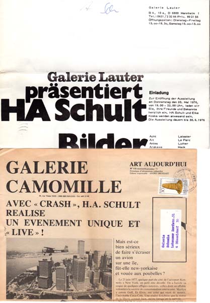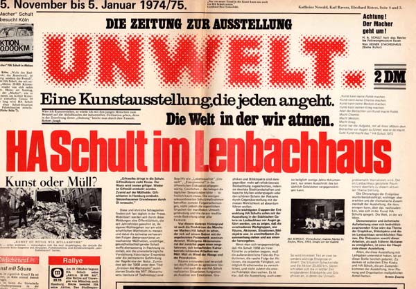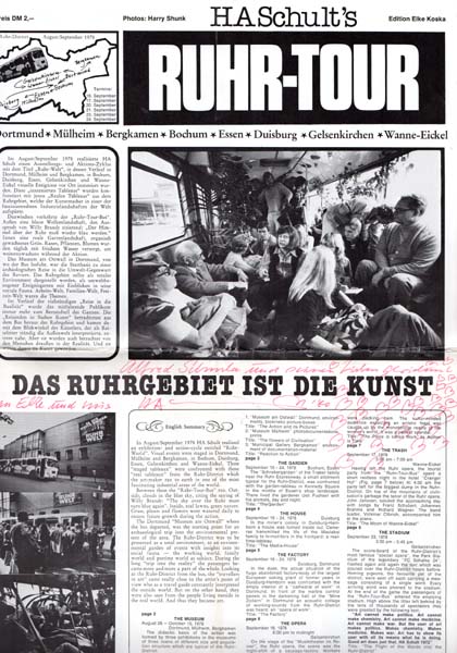 Schult, HA: Ruhr-Tour. Das Ruhrgebiet ist die Kunst. 1. Auflage. Köln. Edition Elke Kosta. 1978. 46 x 32 cm. 8 S. Zeitungspapier. Vierfach gefalten, sonst gutes Exemplar. Mit großflächiger handschriftlicher Widmung HA Schults an Alfred Schmela, mit zahlreichen roten Herzchen umrandet, über den Mittelteil der aufgeschlagenen Zeitung. Katalog zur Aktions-Tour durch das Ruhrgebiet in Form einer Tageszeitung, überwiegend mit Fotografien von Aktionen und Performances.; Beiliegend: HA Schult im Lenbachhaus. Die Zeitung zur Ausstellung Unwelt. Eine Kunstausstellung, die jeden angeht. Im Zeitungsformat (Überformat) gedruckter Katalog zur Ausstellung im Lenbachhaus München, 15. November 1974 bis 5. Januar 1975. 8 S. Mit zahlreichen Beiträgen von und über Schult sowie Fotodokumentationen von Aktionen. Selten.; Ferner beiliegend: Galerie Lauter präsentiert HA Schult. Bilder unserer Welt. Im Zeitungsformat gedruckte Einladung zur Ausstellungseröffnung am 20. Mai 1976 in der Galerie Lauter, Mannheim. 4 S. Folio. Mit einer Biografie und Ausstellungsverzeichnis sowie Fotografien.; Ebenso: Galerie Camomille. Bruxelles. Avec „Crash“, HA Schult realise un evenement unique et „Live“! Art Aujourd´hui, Nr. 1, Septembre 1977. 4 S. Folio. im zeitungsformat gedrucktes Bulletin der Galerie mit Fotos und Texten zu Schult. Adressiert an die Galerie Schmela, Düsseldorf. Mit Briefmarke versehen und gelaufen als Streifbandzeitung (mit 4 cm Fehlstelle im Text und 1 Einriss). Zusammen 4 Dokumente der frühen 70er Jahre zu dem Aktionskünstler HA Schult in Zeitungsformaten in transparenter Plastikkassette.