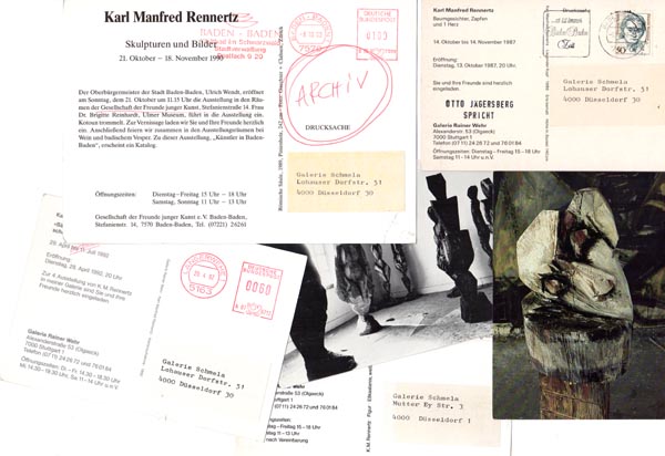 Rennertz, Karl Manfred: Zeichnungen und Holzplastiken 1981/82. Kunstpreis der Stadt Nordhorn 1982. Städtische Galerie Nordhorn 17. Dezember 1982 bis 30. Januar 1983. 1. Auflage. Nordhorn. Städtische Galerie. 1983. Teilweise gering nachgedunkelt und berieben. Sonst insgesamt gutes Exemplar. Interessantes Konvolut von und über den Künstler Karl Manfred Rennertz: der Katalog wurde von Künstler und Galeristin für eine Ausstellung in der Galerie Schmela 1983 als Vorlage zur Stellung der Skulpturen und für weitere Planungen genutzt und dementsprechend auf Innendeckel, hinterem Vorsatz, Verzeichnis der Abbildungen, beiliegenden Einladungskarten etc. für diese Zwecke von beiden mit Markierungen, Marginalien, Skizzen und handschriftlichen Notizen versehen. Unter der Rubrik Gruppen und Einzelausstellungen findet sich handschriftlich der Nachtrag der Ausstellung Schmela 1983 mit dem Verweis auf den Katalog der Ausstellung Skulpturenmuseum Glaskasten, Marl, 3. Juli bis 11. September 1983 (als Begleitkatalog). Es liegt ferner bei: Karl Manfred Rennertz. Holzskulpturen und Zeichnungen. Skulpturenmuseum Glaskasten, Marl, 3. Juli bis 11. September 1983. Band 1 [sowie] Erwin Wortelkamp. Arbeiten in Holz und Eisen 1980-1983. Skulpturenmuseum Glaskasten, Marl, 3. Juli bis 11. September 1983 Band 2. Zur Ausstellung beiliegend der separate Text mit Einführung, die Einladungskarte und das Plakat zur Ausstellung Rennertz (dieses mit Tesaresten an den Ecken). Der Katalog Rennertz ist von dessen Hand im oberen Viertel der Abbildungen mit Preisen oder auch mit Anmerkungen zu Verkäuflich- oder Unverkäuflichkeit versehen worden, ebenso im Verzeichnis der ausgestellten Werke als Richtlinie für die Ausstellung in der Galerie Schmela. Ferner beiliegend: Karl Manfred Rennertz. Römische Skulpturen 1989. 8 S. OKart. Mit beiliegendem handschriftlichen Brief von Manfred Rennertz, 1 1/2 S. mit Verweis auf den zugesandten Katalog und eine zurückliegende Ausstellungseröffnung der Galerie Schmela. Ferner dabei ein Katalog von 1982, 22 S., OBrosch., sowie eine handschriftliche Postkarte Rennertz´an die Galerie Schmela von 1985 sowie 12 weitere Einladungskarten zu Vernissagen, davon 7 adressiert an die Galerie Schmela in Düsseldorf. Interessantes Dokument der Zusammenarbeit zwischen Künstler und Galerie und der Entstehung einer Ausstellung.
