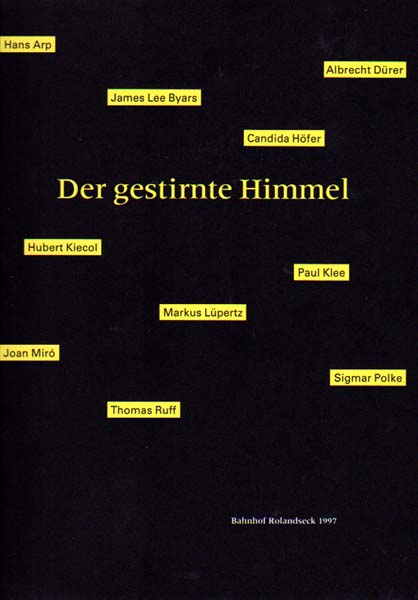 Gohr, Siegfried (Herausgeber): Der gestirnte Himmel. Arp, Byars, Dürer, Höfer, Kiecol, Klee, Lüpertz, Miro, Polke, Ruff. Erste Auflage. Remagen. Bahnhof Rolandseck. 1997. 30 x 24 cm. 64 S. Illustrierter OKarton. Sehr gutes Exemplar. Durchgehend mit meist farbigen Abbildungen versehen. Katalog zur Ausstellung Remagen 22. August bis 19. Oktober 1997.