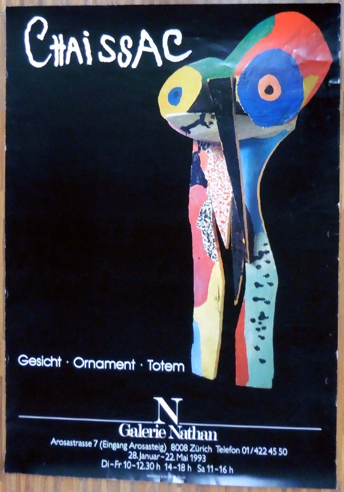 Chaissac, Gaston: Gesicht – Ornament – Totem. [Plakat / Poster]: Galerie Nathan, Zürich, 28. Januar bis 22. Mai 1993. Zürich. Galerie Nathan. 1993. 99 x 69 cm. Bereibungen an den Rändern, insgesamt etwas knitterspurig. Ordentliches Exemplar. Plakat auf schwerem, gestrichenem Papier.