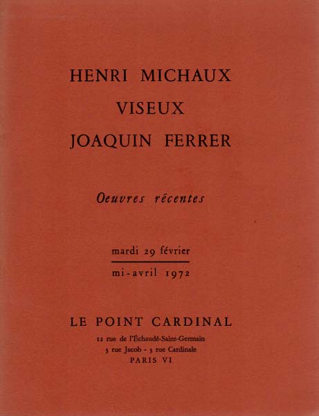 Michaux, Henri [und] Claude Viseux, Joaquin Ferrer: Henri Michaux / Viseux / Joaquin Ferrer. Oeuvres recentes. [Le Point Cardinal, Paris, mardi 29 fevrier – mi-avril 1972. Henri Michaux: Encres de Chine 1966 – 1970 et Peintures acriyliques 1971 – 1972 / Viseux: Sculptures recentes 1971 – 1972 / Joaquin Ferrer: Aquarelles 1970 – 1972]. Erste Auflage. Paris. Le Point Cardinal. 1972. 22 x 17 cm. 24 unpaginierte S. OKarton. Einband vom Rücken her aufgehellt, sonst gutes Exemplar. Enthält 17 auf gelbem Papier gedruckte s/w Abbildungen mit Arbeiten der 3 vorgestellten Künstler. Beiliegend eine Karte zu „Viseux“ von 1973 sowie ein Blatt Vota des Künstlers in Französisch.