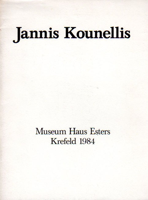 Kounellis, Jannis: Museum Haus Esters Krefeld. 26. Februar bis 29. April 1984. Erste Auflage. Krefeld. Museum Haus Esters. 1984. 28 x 21 cm. 22 S., 1 Blatt. OKarton mit OKlappenumschlag. Kleine Ausfärbung am oberen Rückensteg, sonst gutes Exemplar. Mit einem Textbeitrag von Marianne Stockebrand. Enthält 11 s/w Abbildungen.