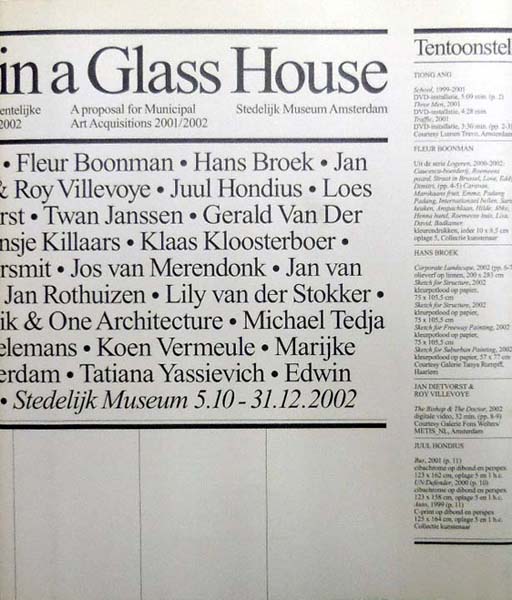 Life in a Glass House. een voorstel tot Gemeentelijke Kunstaankopen 2001/2002 / A proposal for Municipal art Acquisitions 2001/2002. Erste Auflage. Amsterdam. Stedelijk Museum. 2002. 26 x 23 cm. 24, 47, 24 S. OKarton. Gutes Exemplar. Arbeiten, abgebildet auf Farbtafeln, von Loes van der Horst, Twain Janssen, Klaas Kloosterboer, George Korsmit, [und weitere]. Texte in Niederländisch und Englisch.