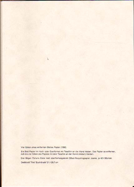 Eichhorn, Maria: Vier Ecken eines entfernten Blattes Papier (1992). Ein Blatt Papier im Hoch- oder Querformat mit Tesafilm an die Wand kleben. Das Papier so entfernen, daß die vier Ecken des Papiers mit dem Tesafilm an der Wand (kleben) bleiben. Drei Bögen Fortuna Color matt oberflächengeleimt Offset-Recyclingpapier, creme, je 42 x 59,4 cm. Deckblatt / Titel / Buchdruck / 21 x 29,7 cm. o. O. Maria Eichhorn. 1992. 30,1 x 22,4 x 1,5 cm. 4 unpaginierte Blätter. Pappschachtel. Schachtel etwas nachgedunkelt, sonst sehr gutes Exemplar. Konzeptuelle Arbeit Maria Eichhorns in unlimitierter Auflage. Zur Herstellung des Kunstwerks liegen, wie in der Handlungsanweisung auf dem Textblatt / Deckblatt beschrieben, drei Papierbögen (ausgefaltet je 42 x 59,4 cm) neben dem Textblatt vor. Die Blätter befinden sich in einer Pappschachtel. „In „Vier Ecken eines entfernten Blattes Papier“ (1991) hat Maria Eichhorn das potentielle Bild beseitigt. Alles oder nichts kann auf dem ausgerissenen Stück zu sehen gewesen sein: „Kantig“ unterläuft Eichhorn die kunstbetriebliche Objektbegierde“ (Info zur Ausstellung „Hardly Anything“ Vonhundert).[Vgl. Maria Eichhorn. Werkverzeichnis 1986 – 2015. S. 204].
