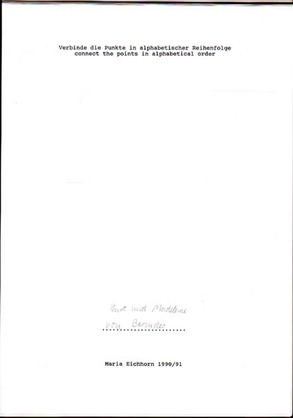 Eichhorn, Maria: Verbinde die Punkte in alphabetischer Reihenfolge. connect the points in alphabetical order. o. O. o. V. 1990 / 1991. 31 x 22 x 1,5 cm. [28] unpaginierte S.; [11] unpaginierte S. (geheftet) Pappschachtel. Pappschachtel leicht nachgedunkelt. Sonst sehr gutes Exemplar. Durchgehend mit schwarz-weißen Abbildungen in Kopie versehen. Konzeptuelle Arbeit Maria Eichhorns in unlimitierter Auflage. Ein Textblatt in Kopie mit Handlungsanweisungen für die 28 unpaginierten, kopierten Seiten, die an den Rändern mit Buchstaben und Zahlen versehen sind. Die Herstellung bzw. Vollendung des Kunstwerks erfolgt durch den Käufer / Rezipienten. Als Beigabe befindet sich ein Konvolut von Texten zur Arbeit in Kopie. Die Texte von Margarita Albrecht, Marius Babias, Knut Bayer, Gerti Fietzek, Heinz-Werner Lawo und Reiner Matzker. Mit einem Namenseintrag des Sammlerehepaars, welches die Arbeit bezogen hat, in Bleistift auf der dafür vorgesehenen, gestrichelten Linie auf dem Textblatt / Deckblatt von der Hand der Künstlerin. [Vgl. Maria Eichhorn. Werkverzeichnis 1986 – 2015. S. 2168-169].