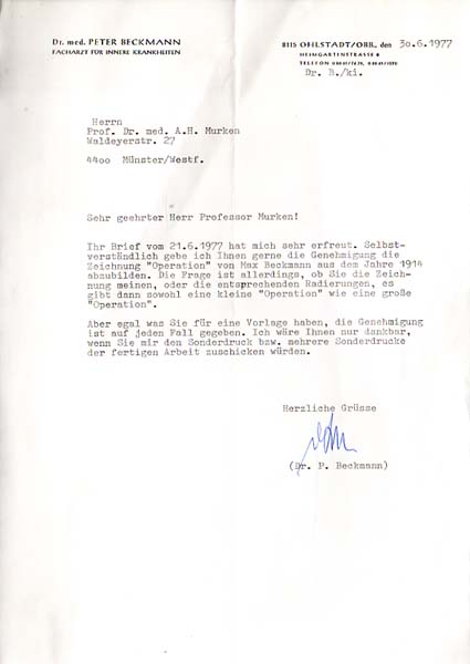 Beckmann, Peter: Maschinenschriftliches Schreiben an einen Kunsthistoriker. 29,6 x 19,9 cm. 1 Blatt. Gutes Exemplar. 19-zeiliges, maschinenschriftliches Schreiben Peter Beckmanns vom 30. Juni 1977 mit dessen handschriftlicher Signatur an den deutschen Arzt, Sammler und Kunsthistoriker Axel Hinrich Murken, die Reproduktionsgenehmigung für die Arbeit „Operation“ (1914) von Max Beckmann betreffend. Peter Paul Christoph Beckmann (* 31. August 1908 in Hermsdorf bei Berlin; † 25. Februar 1990 in München), Sohn des Malers Max Beckmann, war ein deutscher Mediziner, Gerontologe und Kunstsachverständiger.