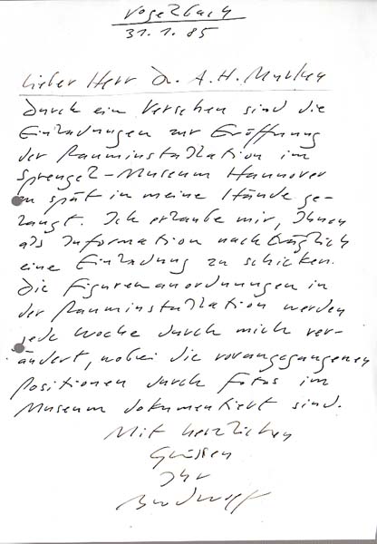 Brodwolf, Jürgen: Handschriftliches Schreiben an einen Kunsthistoriker. 29,6 x 20,9 cm. 1 Blatt. Schreibmaschinenpapier gelocht, unregelmäßig beschnitten und minimalst nachgedunkelt, sonst gutes Exemplar. 21-zeiliges, handschriftliches Schreiben (schwarzer Faserschreiber) Jürgen Brodwolfs vom 31. Januar 1985 auf Schreibmaschinenpapier mit dessen handschriftlicher Signatur an den deutschen Arzt, Sammler und Kunsthistoriker Axel Hinrich Murken, eine Einladung zu einer Ausstellung des Künstlers im Sprengel-Museum Hannover betreffend. Jürgen Brodwolf (* 14. März 1932 in Dübendorf) ist ein Schweizer Bildhauer und Objektkünstler, wohnhaft in Kandern.
