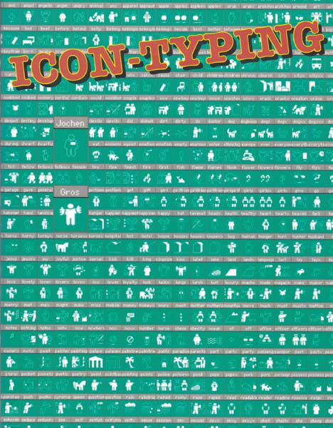 Gros, Jochen: Icon-Typing. Piktogramme und Icons in OpenType. Pictograms and Icons in OpenType Erste Auflage. Norderstedt. Eigenverlag/ Books on Demand. 2006. 22 x 17 cm. 110 unpaginierte S. Illustrierter OKarton. Sehr gutes Exemplar. Durgehend mit Abbildungen versehen. Inliegend 1 CD zum Thema Icon-Typing. Text in deutscher und englischer Sprache.