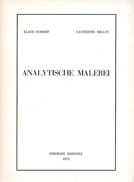 Honnef, Klaus / Millet, Catherine: Analytische Malerei. Analytic Painting. Peinture Analytique. Pittura Analitica. Erste Auflage. Genua / Mailand / Düsseldorf. Editzioni Masnata. 1975. 21,5 x 15,8 cm. [152] unpaginierte S. Illustrierter OKarton. Einband lichtrandig und minimalst angestaubt, innen papierbedingt an den Rändern wenig lichtrandig, sonst gutes Exemplar. Durchgehend mit schwarz-weißen Abbildungen versehen. Der von Klaus Honnef kuratierte Teil der gleichnamigen Ausstellung in der Galerie La Bertesca in Genua, Mailand und Düsseldorf im Jahre 1975 umfasste Arbeiten u. a. von Winfred Gaul, Raimund Girke und Jerry Zeniuk, der von der Kunsthistorikerin und späteren Schriftstellerin Catherine Millet betreute Teil Werke von Martin Barre, Carlo Battaglia, John Seery, Claude Viallat u. a.